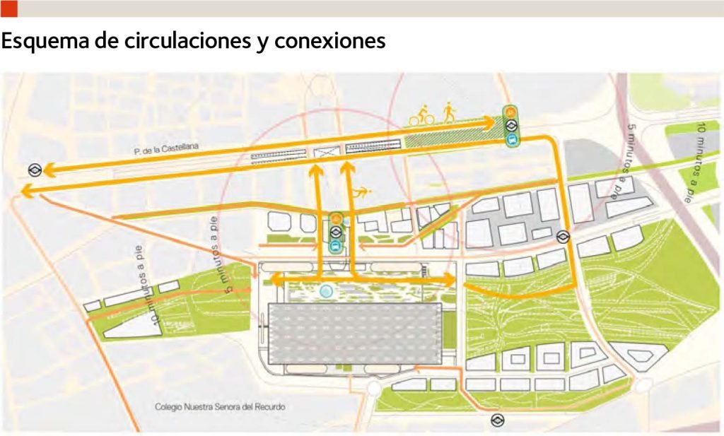La actual estación de Chamartín fractura y no permite la conexión norte-sur y este–oeste de la ciudad. El trazado de la nueva plaza propone dar continuidad a los parques norte y sur de modo que la estación no suponga una barrera entre ambos, facilitando al mismo tiempo el flujo este-oeste hasta el nuevo intercambiador de transportes y con el paseo de la Castellana.