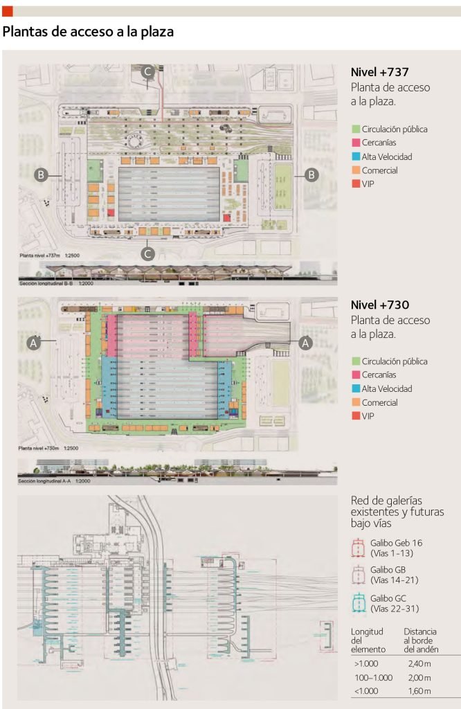 La propuesta arquitectónica ha sido muy ambiciosa, creando una plaza por encima de Cercanías en el nivel (+737), estudiando la no afección de la funcionalidad ferroviaria y generando la oportunidad de proporcionar una nueva intervención a través del centro de la estación en el nivel (+730), que cumple varios objetivos al crear un puente sobre los andenes de Cercanías que ayudará a aliviar la densidad de los flujos de pasajeros en el nivel de cota (+724) y un sistema operativo que puede contribuir a aliviar la carga de la densidad de viajeros asociada a los pasajeros de Cercanías que hacen transbordo al Metro. En otras palabras, si el nivel bajo andenes (+716) estuviera saturado por alguna razón, el nuevo puente de entrepiso en este nuevo nivel (+730) ayudaría a aliviar la congestión.