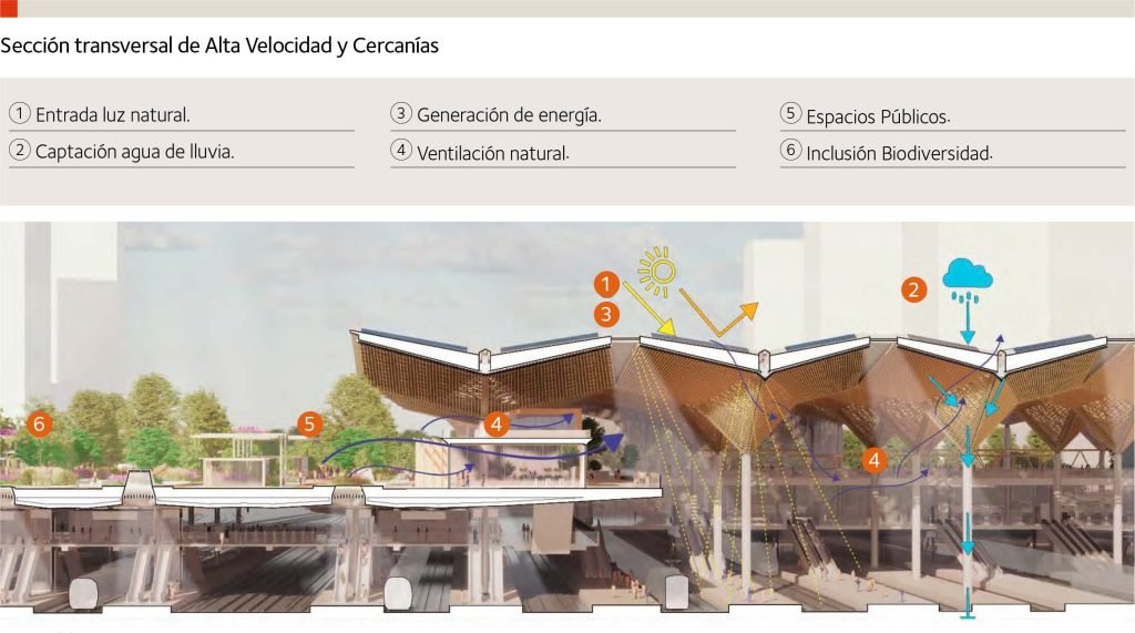 Esto ha determinado la importancia en el diseño de las zonas asociadas a Cercanías y sus intercambios modales aproximando, respecto a lo planteado en el estudio informativo, la nueva terminal norte de Cercanías al eje de la estación, y facilitando el intercambio con la red de Metro y los servicios de Alta Velocidad.