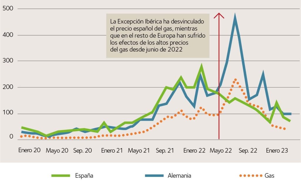 El mercado eléctrico europeo muy ligado, como hemos comentado anteriormente, al precio del gas, ha sufrido las mismas consecuencias. En España, sin embargo, la aprobación de la denominada «excepción ibérica» en junio de 2022, que regulaba un tope al precio del gas para la formación del precio eléctrico, ha servido para mantener los precios más estables y considerablemente inferiores al resto de los mercados europeos.