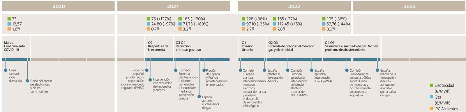 Al objeto de ilustrar cómo ha evolucionado el mercado de la electricidad y la respuesta regulatoria en el período que comienza con la crisis sanitaria de la COVID-19 y se encadena con la guerra en Ucrania, así como su repercusión sobre los precios del gas y otras materias primas, se muestran los principales eventos en el período y su impacto en los precios.