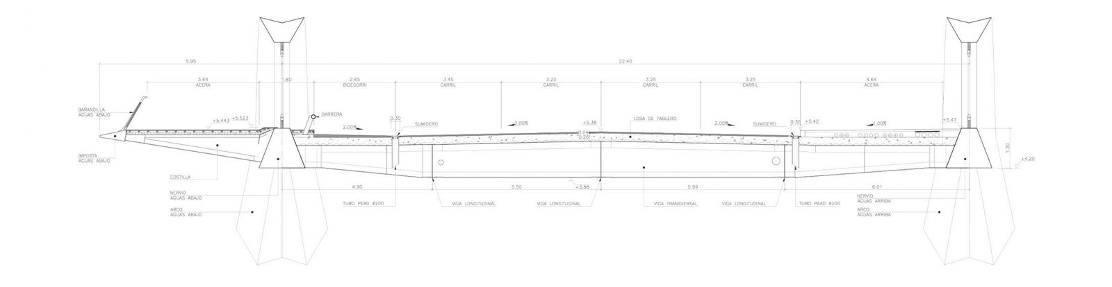 Bajo los arcos, en acero, dos nervios longitudinales de sección prismática integran el tablero, formando el cordón de tracción del arco y anclando las péndolas que cuelgan la plataforma. La zona central del tablero y la zona volada de la acera están formadas por dos costillares metálicos. Aguas abajo, la zona volada finaliza en un pronunciado saliente o “nariz”. Aguas arriba, son los propios elementos estructurales, sin elemento ornamental alguno, los que componen la forma.