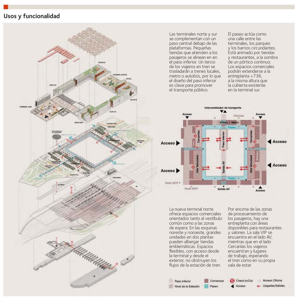 Los viajeros, vecinos, visitantes, trabajadores y el público que acudirá a los trenes, a las oficinas, a los espectáculos o a practicar deporte garantizan una vida constante; una demanda de actividades ligadas al esparcimiento que asegura la mejor vitalidad social para un nuevo espacio a consolidar en el futuro. Así, se concibe en esta propuesta un espacio multifuncional, abierto, diverso, pensado principalmente para viajeros y trabajadores, para los usuarios que lo utilizarán diariamente porque pertenece al barrio en el que viven o trabajan, pero también para los que disfrutarán de él porque lo consideran un destino, aunque vengan de lejos.
