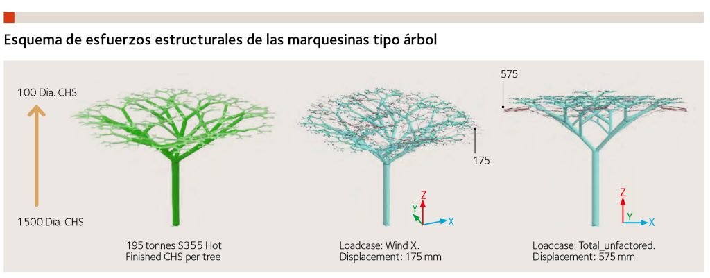 La estructura de cada árbol se compone de secciones huecas circulares de acero, cuyo diámetro se reduce desde el tronco hasta las ramas superiores para conferirle una mayor eficiencia estructural y valor estético. Desarrolladas como una geometría fractal, las ramas pueden diseñarse siguiendo una estrategia de mecano, formado por componentes estructurales y uniones estandarizadas. Este enfoque aporta una reducción de costes, ya que los distintos componentes serán cuidadosamente desarrollados para permitir una secuencia de construcción modular y repetitiva.