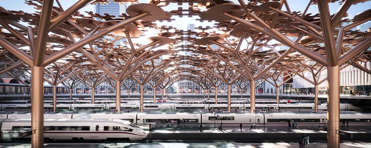 La nueva estación, en realidad, la Nueva Plaza, requiere un tratamiento especial. La propuesta hace posible visualizar los trenes desde las superficies de paso y estanciales que, como extensión de los bajos de los edificios de oficinas o de las terminales, balconeen sobre los andenes. A la vez, e insistiendo en su excepcionalidad, se plantea tratar el espacio interior del cuadrilátero como un bosque inesperado, concibiendo y tratando de forma arbórea las columnas de soporte de la cubierta y la superficie de cubrición como una densa suma de copas que arrojan sombra de día y luz de noche.