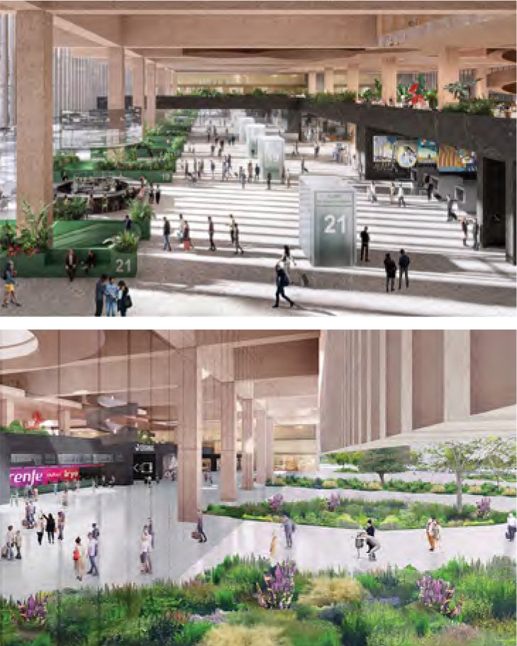 La Nueva Plaza requiere un tratamiento especial. Hacemos posible visualizar los trenes desde las superficies de paso y estanciales que, como extensión de los bajos de los edificios de oficinas o de las terminales, balcone en sobre los andenes. A la vez, e insistiendo en su excepcionalidad, se plantea tratar el espacio interior del cuadrilátero