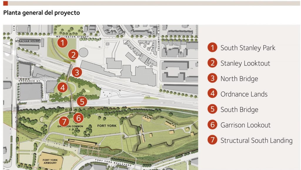 El tan esperado Garrison Crossing es una pieza importante del plan de movilidad peatonal de Toronto, que conecta una serie de barrios del centro de la ciudad al norte del corredor ferroviario, con Fort York y el lago Ontario, uniendo parques y espacios verdes. El proyecto no es simplemente una nueva adición a la infraestructura de Toronto, sino un espacio social que promueve la interacción humana sostenible con el entorno, además de destacar el patrimonio cultural de la ciudad.