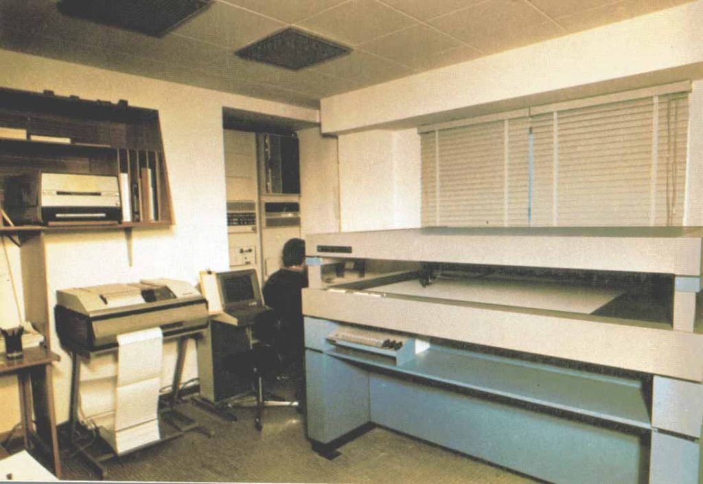 Como curiosidad, dadas las dimensiones y necesidades del plóter, para ubicarlo fue necesario demoler un tabique de la fachada e instalar en su emplazamiento el aire acondicionado. Aquel aparato era casi único en España, pues solamente había otros dos: uno en Dragados y otro, en El Corte Inglés. Cuando se estropeaba venía un técnico de París que era el encargado de su mantenimiento. Aquello un avance frente a la delineación clásica y cambió mi forma de trabajo al incorporarme como operador de este nuevo sistema. Cuando más tarde también quedó obsoleto, se pasó al CAD.