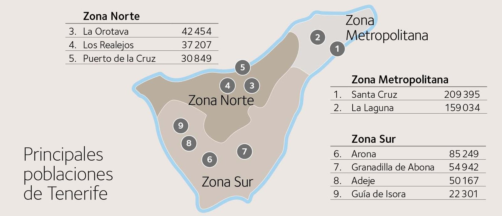La isla está dividida en 31 municipios que se podrían agrupar en tres grandes zonas: al noreste, el área metropolitana en torno a Santa Cruz y La Laguna, la más poblada; la zona norte, con el valle de la Orotava, donde está situado el Parque Nacional del Teide, y que incluye, además, Puerto de la Cruz y Los Realejos; y la zona sur, con la ciudad turística, principalmente los municipios de Adeje, Arona, Guía de Isora y Granadilla.