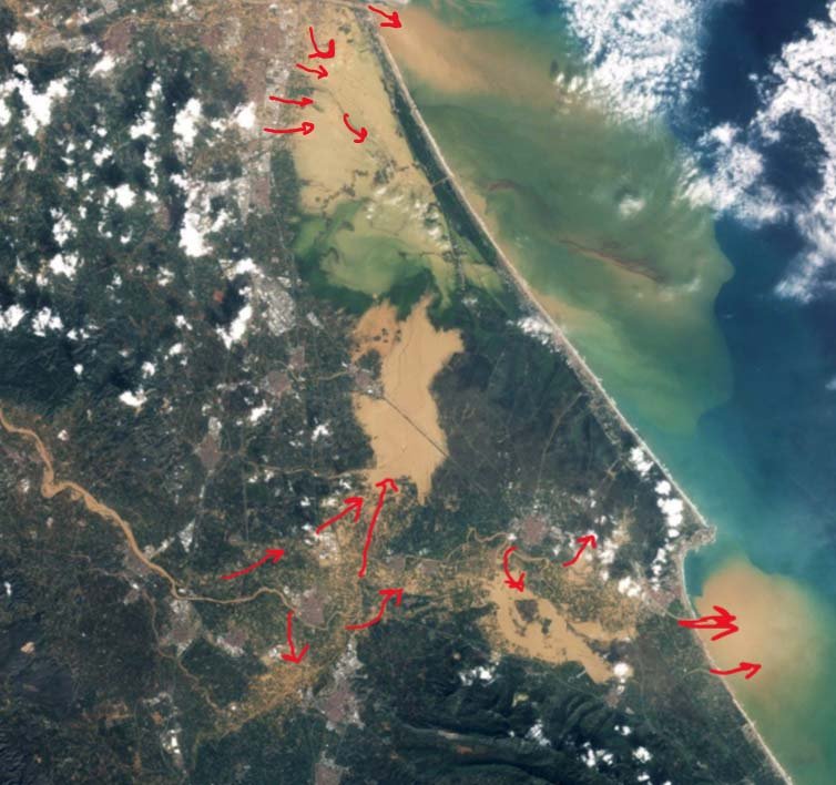 En la imagen inferior se puede observar el efecto producido mediante la visualización satelital. Se aprecia al norte la salida al mar del río Turia (Plan Sur); debajo, la inundación masiva en dirección al lago de la Albufera de la Rambla del Poyo y más al sur, el río Magro, que se abre después de Carlet al modificarse ligeramente la geomorfología de la cuenca, pasando de cóncava a convexa.