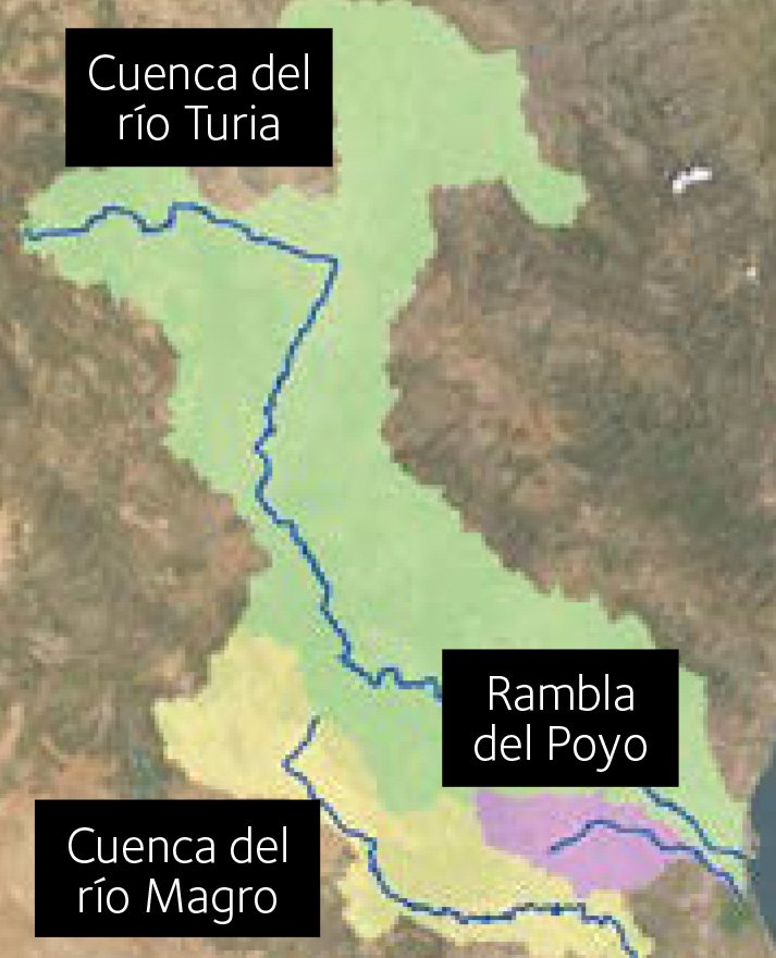 Vemos al norte la cuenca del río Turia; al sur, la del río Magro; y, en medio, la de la Rambla del Poyo. Voy a tratar de identificar aquellos aspectos que parecen tener más interés para la sociedad.