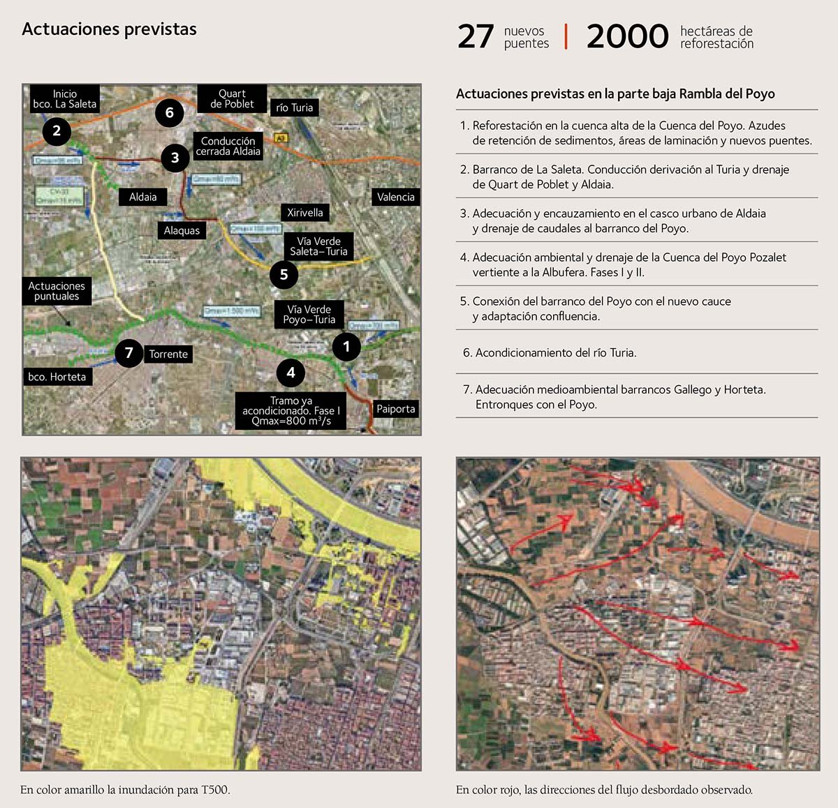 En las imágenes inferiores de abajo. se ve en amarillo la inundación para T500. A la derecha las direcciones del flujo desbordado observado.