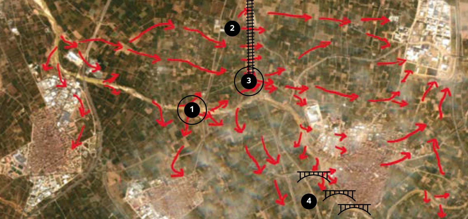 En el esquema de flujos desbordados sobre estas líneas, vemos el efecto de las infraestructuras de comunicación, la A-7 en L’Alcúdia y vía de acceso a la población; el desbordamiento por ambas márgenes del Magro a la altura del cruce en sifón de la Acequia Real del Júcar, así como el efecto del trazado del AVE, la carretera de circunvalación de Algemesí y los tres puentes antiguos sobre el Magro en dicha población.